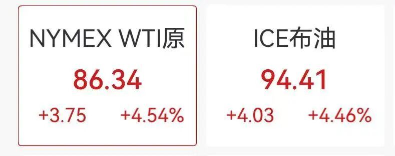 国际油价大涨超4%,截至22时30分,纽约期油报86.3美元/桶,布伦特原油报94.4美元/桶。