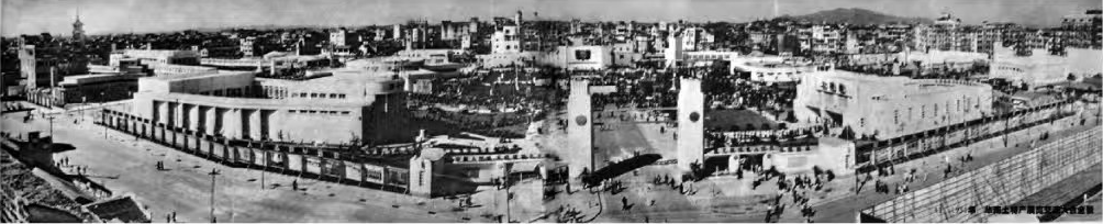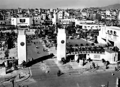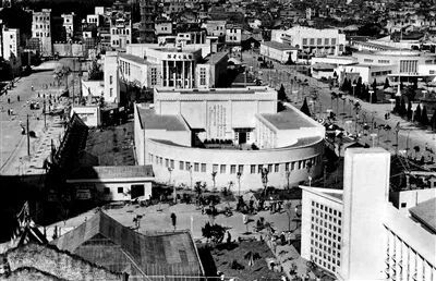 华南土特产展览交流大会,前景建筑为工矿馆,后景建筑为物资交流馆