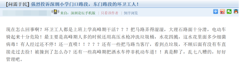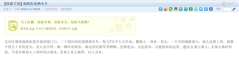 有深圳论坛网友反映,宝安区福海街道幸福花园门口二十四区间的洒水车,每天7点半左右作业,作业人员“见人也不停”“洒路人一身水一身尘”。深圳小学门口路段上班、上学高峰期也成了洒水车的工作时段,“有人经过还不停,一直喷”,电动车骑行在洒过水后的湿滑路面十分危险。