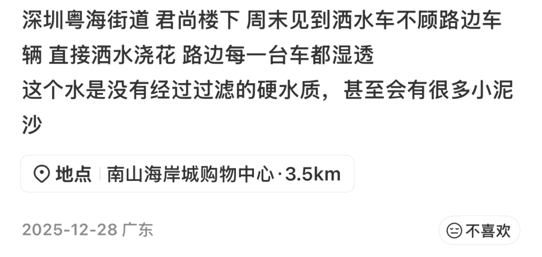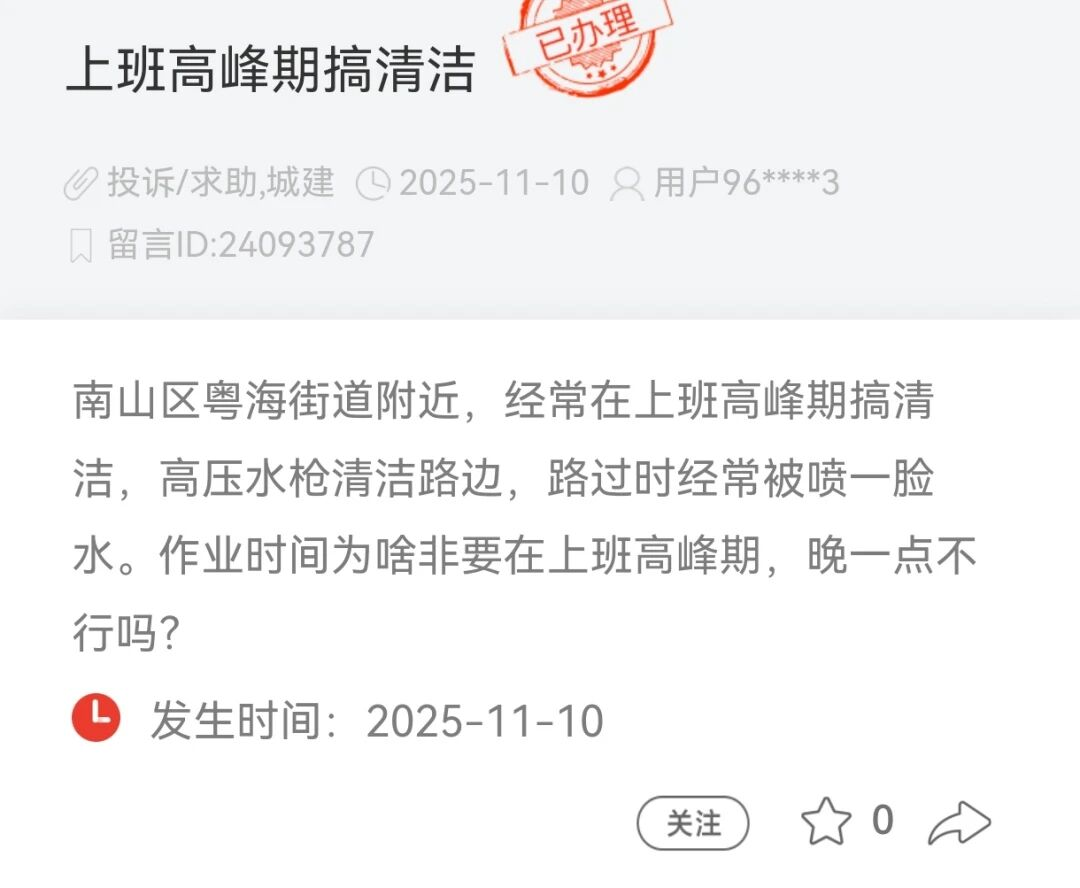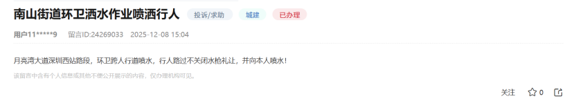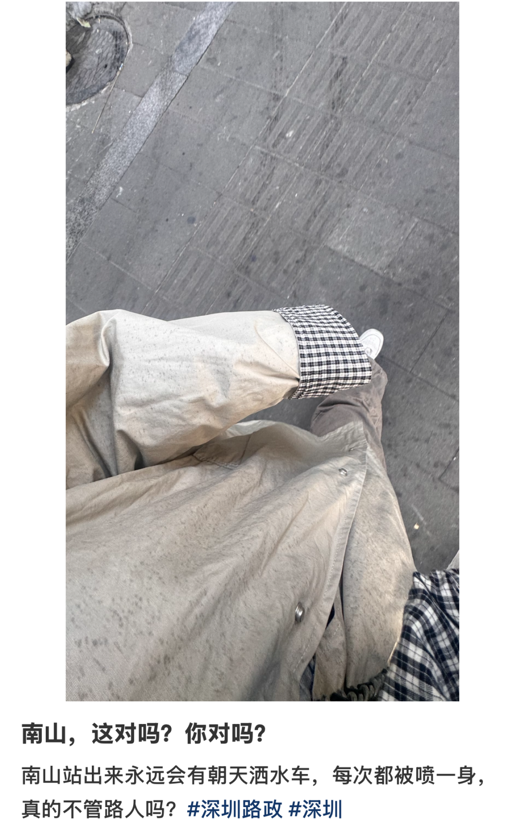 2025年11月,有市民通过人民网“领导留言板”反映,南山区粤海街道附近“经常在上班高峰期搞清洁,高压水枪清洁路边,路过时经常被喷一脸水”。同年12月,有市民反映“月亮湾大道深圳西站路段,“环卫跨人行道喷水,行人路过不关闭水枪礼让,并向本人喷水”。社交平台上,有市民时常被高空洒落的水雾淋湿衣物,“南山朝天洒水车,每次路过都被喷一身”。