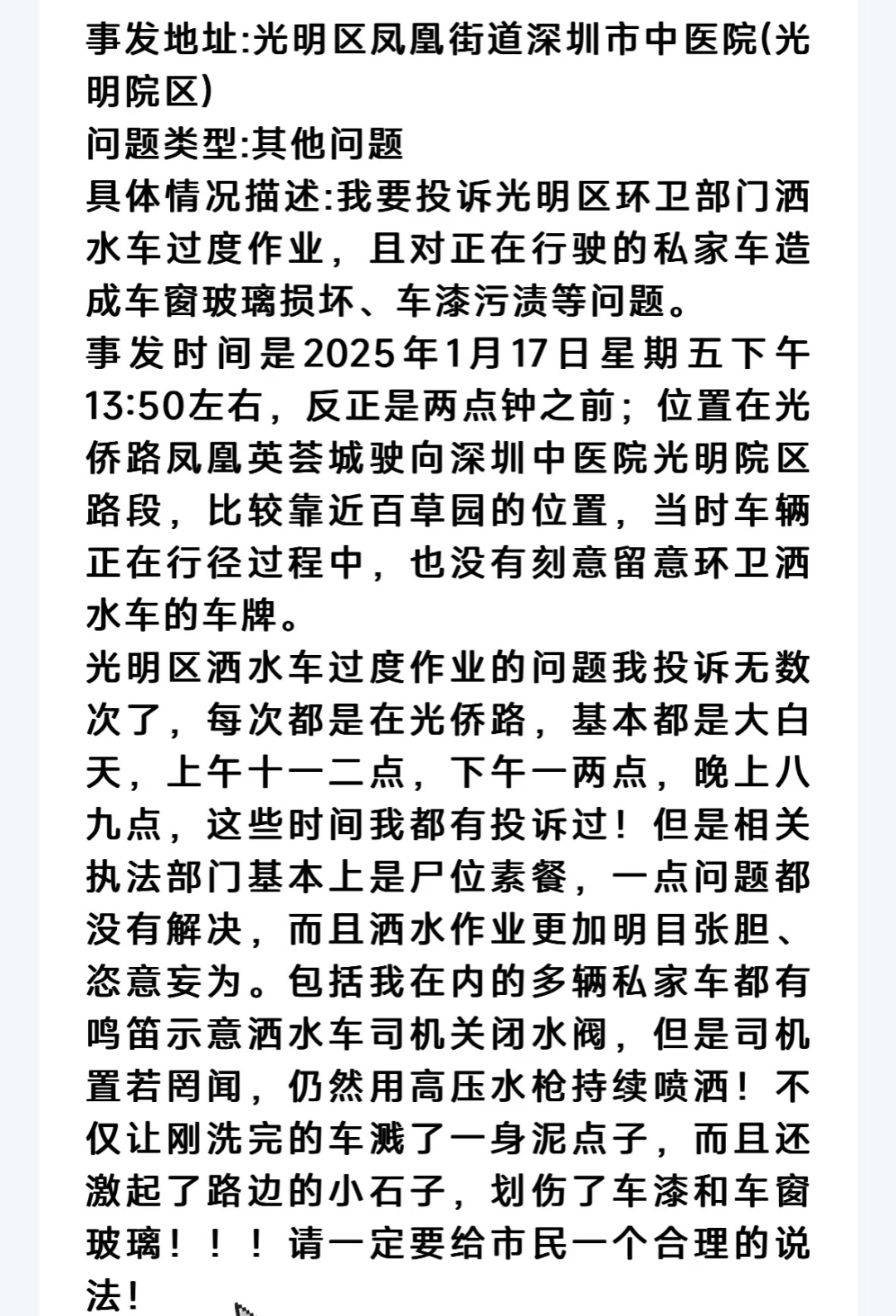 沿街停放及路上行驶的车辆同样深受其害。有车主吐槽,洒水车变“喷水车”,“所到之处,飞沙走石”。有光明区车主反馈,洒水车存在明显“过度作业”,即便车主鸣笛示意关闭水阀,司机仍用高压水枪持续喷洒。刚清洗完毕的车辆被溅满泥点,飞溅的碎石还会划伤车漆、撞击车窗玻璃。